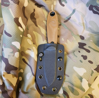 The knife comes with a snugly fitted Kydex sheath and has a removable clip and ball chain necklace to wear as a neck knife.